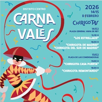 Estas actividades forman parte de la campaña de Carnaval 2026 en los distritos de Madrid. La información ha sido proporcionada por madrid.es. Al hacer clic en una actividad, se abrirá una nueva ventana con más detalles.